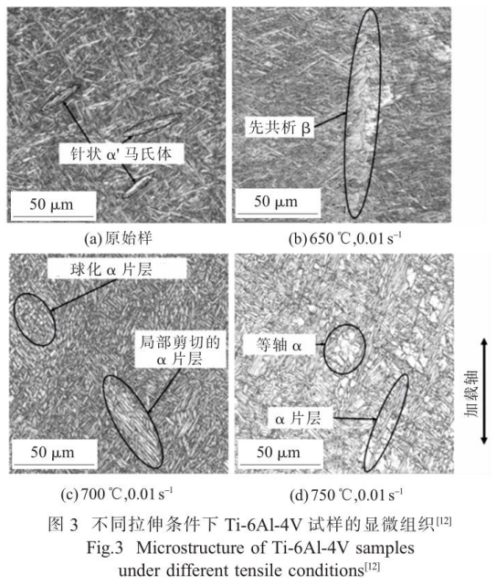 Lv等[2利用激光熔融沉積(LMD)制備了Ti-6Al4V樣品,利用電輔助高溫拉伸試驗在不同的應變速率和溫度(650700、750℃)下進行了高溫拉伸試驗。結果表明,材料的流動應力與溫度呈負相關,與應變率呈正相關。原始材料中的針狀馬氏體在高溫應力下開始破碎,使片層變粗(圖3(c)),變形后大角度晶界的比例從81.4%明顯增加到87.5%~90.7%。高溫下沉積的Ti-6A1-4V樣品的微觀變形機制主要是不連續的動態再結晶和動態球化。疲勞制度下(即400MPa),三種材料在平均疲勞壽命方面的表現相似。試樣疲勞壽命的變化可歸因于試樣中存在的缺陷數量、大小和位置,因為在高循環疲勞中,近表面缺陷可導致局部應力集中。