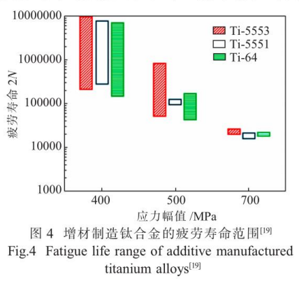 Yasin等[19]研究了兩種增材制造鈦合金Ti-5A15V-5Mo-3Cr(Ti-5553)和Ti-5A1-5Mo-5V-1Cr-1Fe(Ti5551)的疲勞性能。圖4為增材制造鈦合金的疲勞壽命范圍,其中Ti-64為對比試樣。可以看出,對于測試的三個應力水平(400、500和700MPa),Ti-5553在疲勞破壞的平均逆轉方面略勝于Ti-55511。在大多數情況下,疲勞試樣的裂紋產生是由于靠近表面的缺陷。此外,與增材制造Ti-64的疲勞壽命相比,在低循環疲勞制度下(即700MPa),試樣的平均壽命有相當大的差異。在高循環疲勞制度下(即400MPa),三種材料在平均疲勞壽命方面的表現相似。試樣疲勞壽命的變化可歸因于試樣中存在的缺陷數量、大小和位置,因為在高循環疲勞中,近表面缺陷可導致局部應力集中。