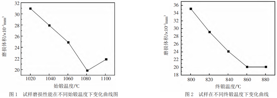 (1)當始鍛溫度不斷上升至1100℃時,無論是試樣磨損體積,還是單位面積增重均呈現先減小后增加的趨勢,當始鍛溫度達到1080℃時,其試樣的磨損體積有所下降,其下降幅度達到35.48%,單位面積質量增重有所下降,其下降幅度達到36.36%。當終鍛溫度達到860℃時,試樣的磨損體積繼續下降,下降幅度為42.86%,單位面積質量增重也出現明顯下降,其下降幅度達到39.13%。