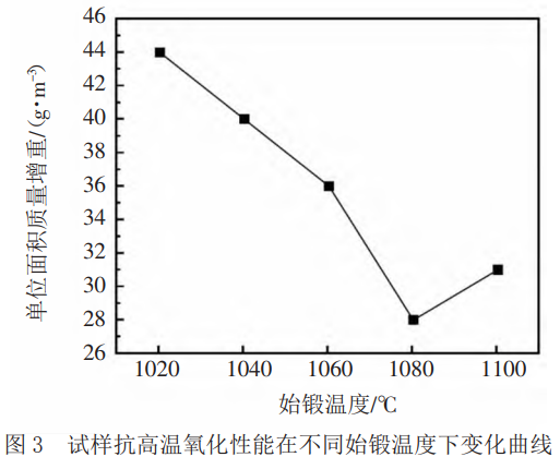 在機械緊固件使用下,試樣抗高溫氧化性能在不同始鍛溫度下變化曲線如圖3所示,從圖3中可以看出,始鍛溫度最小值為1020℃,最大值為1100℃,對于新型鈦合金而言,其單位面積質量增重最小值為8g.m-2,最大值為44g.m-2,整體呈現先降低后上升的趨勢。該試樣抗高溫氧化性能會隨著單位面積質量增加的不斷下降而呈現不斷下降的趨勢。所以,當始鍛溫度分別達到1020℃時,試樣單位面積質量增重達最大值,即44g.m-2;當始鍛溫度達到1040℃時,試樣的單位面積質量增重有所下降,降至40g.m-2;當始鍛溫度達到1060℃時,新型鈦合金試樣的單位面積質量增重為36g.m-2;當始鍛溫度達到1080℃時,試樣的單位面積質量增重繼續下降,降至28g.m-2;當始鍛溫度達到1100℃時,試樣的單位面積質量增重逐漸上升,升至31g.m-2。當始鍛溫度達到1080℃時,鍛造所對應的合金磨損單位面積質量達到最小值,其減小幅度達到36.36%,從而獲得最佳抗高溫氧化性能。為提高機械緊固件所使用的新型鈦合金抗高溫優化性能,需將試樣的始鍛溫度設置為1080℃。