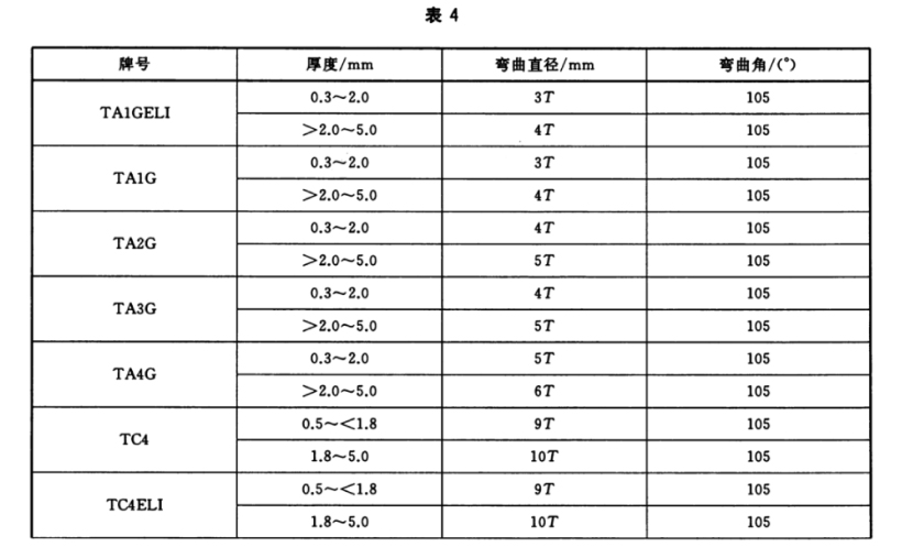 厚度不大于5.0mm的板材應進行彎曲試驗,彎曲直徑和彎曲角應符合表4的規定。彎曲后彎曲部位應無裂紋。